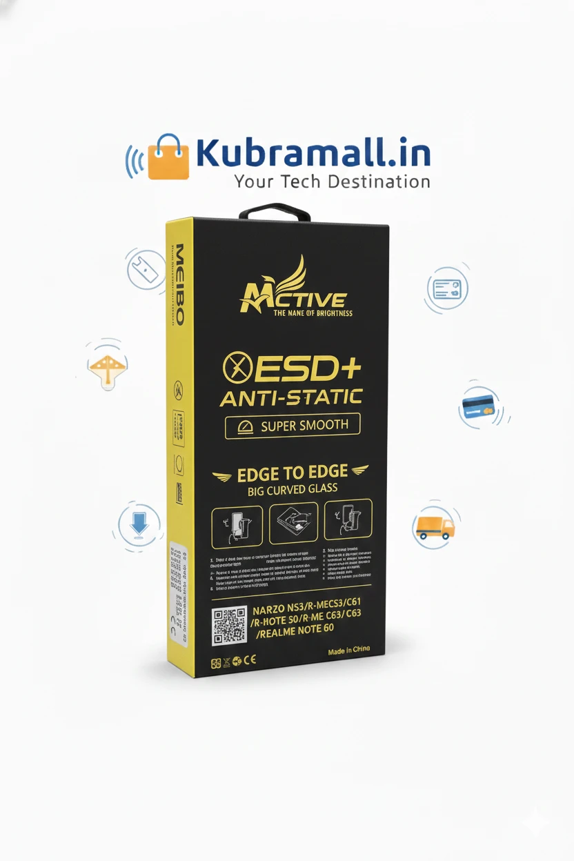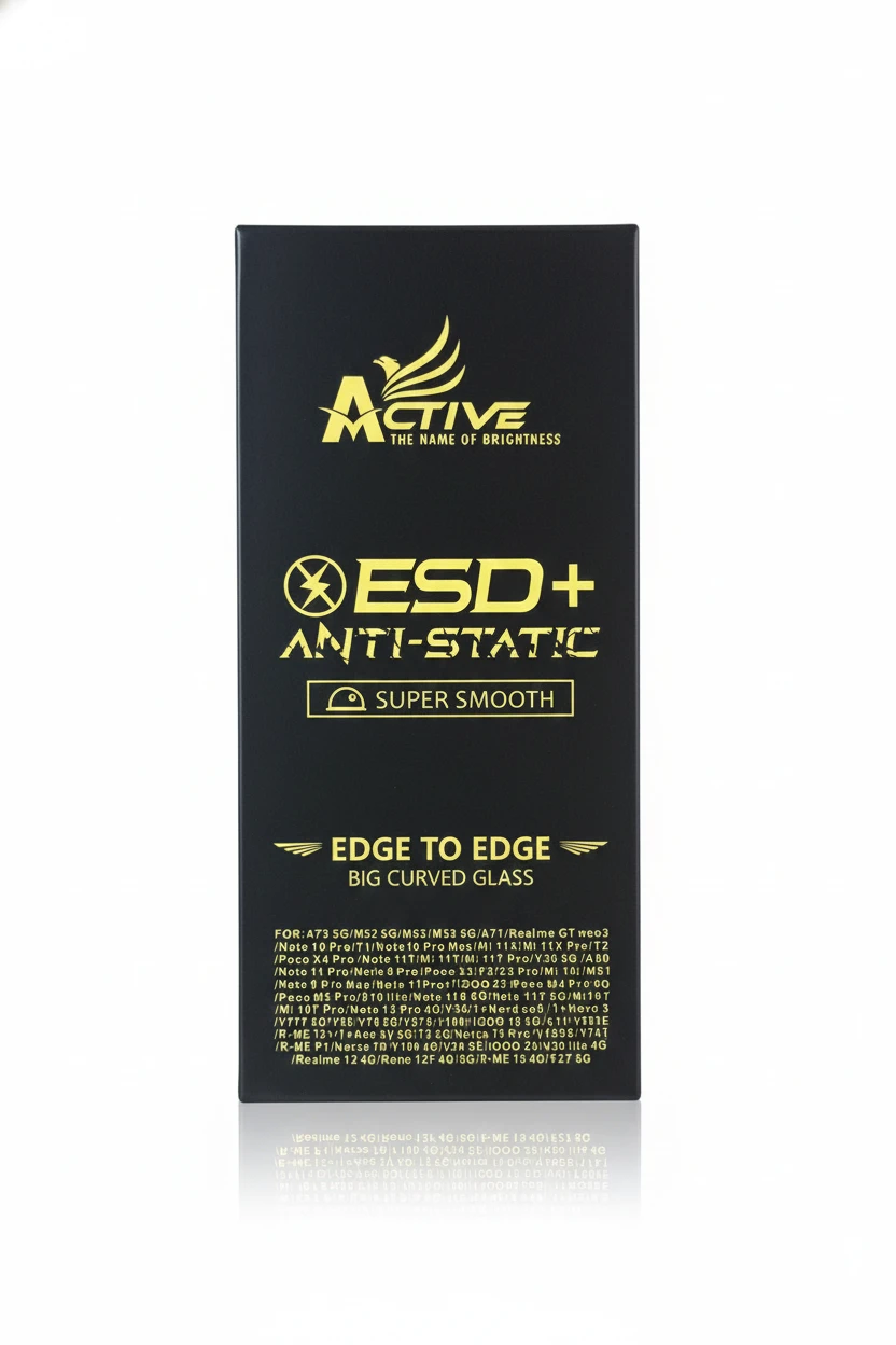 ✅ Product DescriptionThe ACTIVE ESD+ Anti-Static Big Curved Tempered Glass provides premium, edge-to-edge display protection with ultra-smooth touch sensitivity. Its ESD+ anti-static coating prevents dust from sticking during installation, ensuring a clean, bubble-free finish. Equipped with HD clarity, curved edge coverage, explosion-proof protection, and smudge-resistant coating, this screen guard is ideal for users looking for premium protection with smooth performance. Perfect fit for a wide range of Oppo, Vivo, and Realme smartphones (full list below). ✅ Key Features✔ ESD+ Anti-Static Technology – Zero dust during installation ✔ Big Curved Glass – Full edge-to-edge protection ✔ Super Smooth Touch – Sensitive, lag-free screen response ✔ HD Clear Transparency – True screen colors ✔ Smudge-Proof Coating – Reduces fingerprints and oil ✔ Impact Resistant – Strong 9H hardness protection ✔ Fast Exhaust Layer – Bubble-free installation ✔ Explosion-Proof Layer – Safe and durable ✅ Supported ModelsOppo