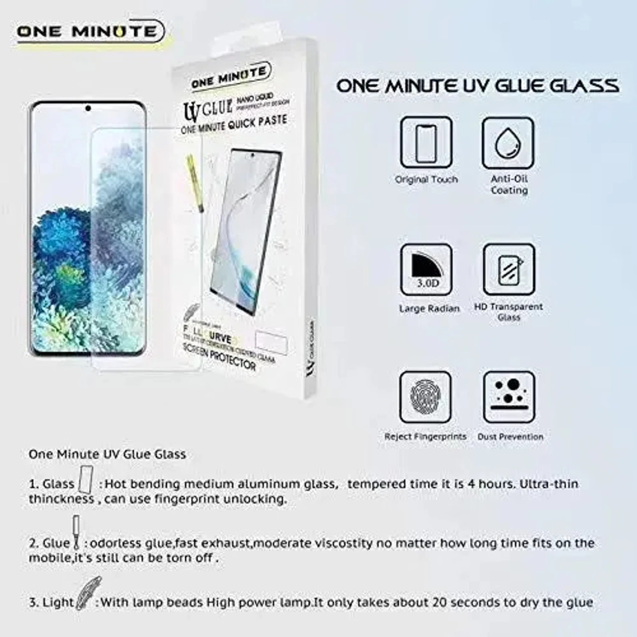 - one minute uv glass (tempered glass) ,1uv glue ,1uv light and cleaning cloth and cleaning sticker
