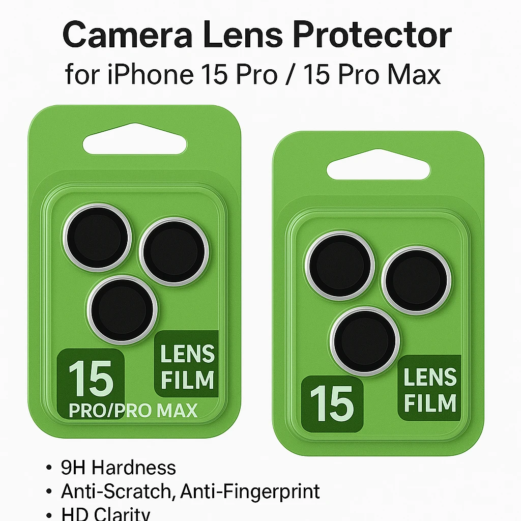 📜 Description (EN): Premium tempered glass camera lens protector designed for iPhone 15 Pro and 15 Pro Max. It provides ultimate protection against scratches, dust, and fingerprints while maintaining the original photo clarity. Easy to install, bubble-free, and precisely cut to fit the camera lens perfectly without affecting flash or picture quality. ⚙️ Specifications / Highlights: