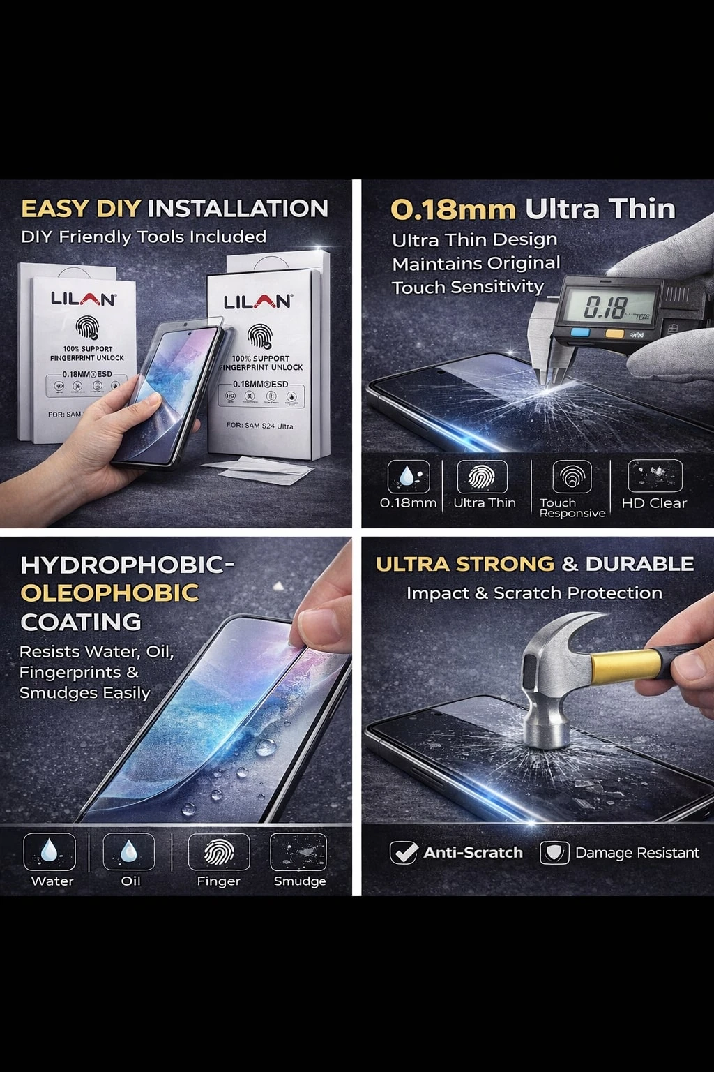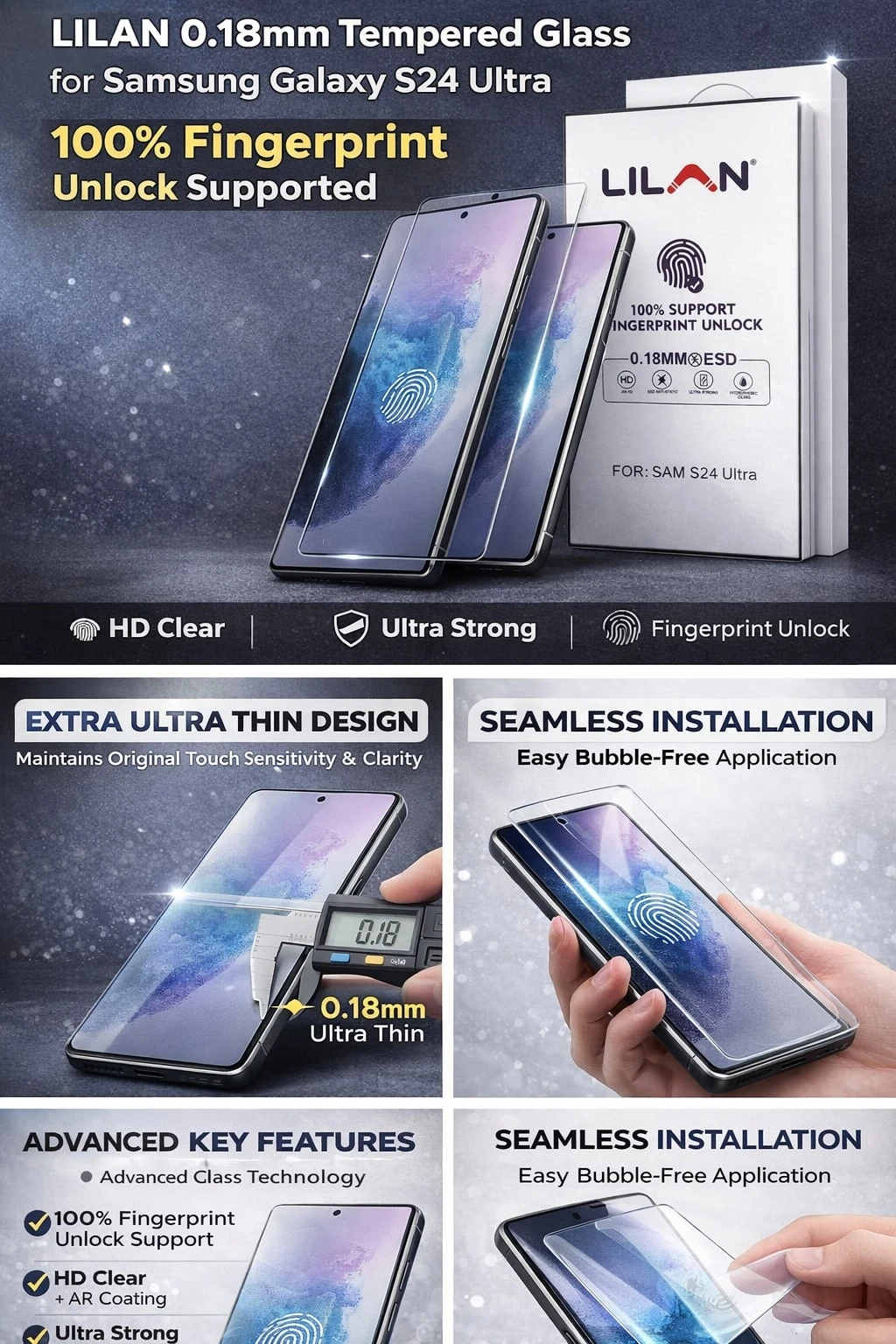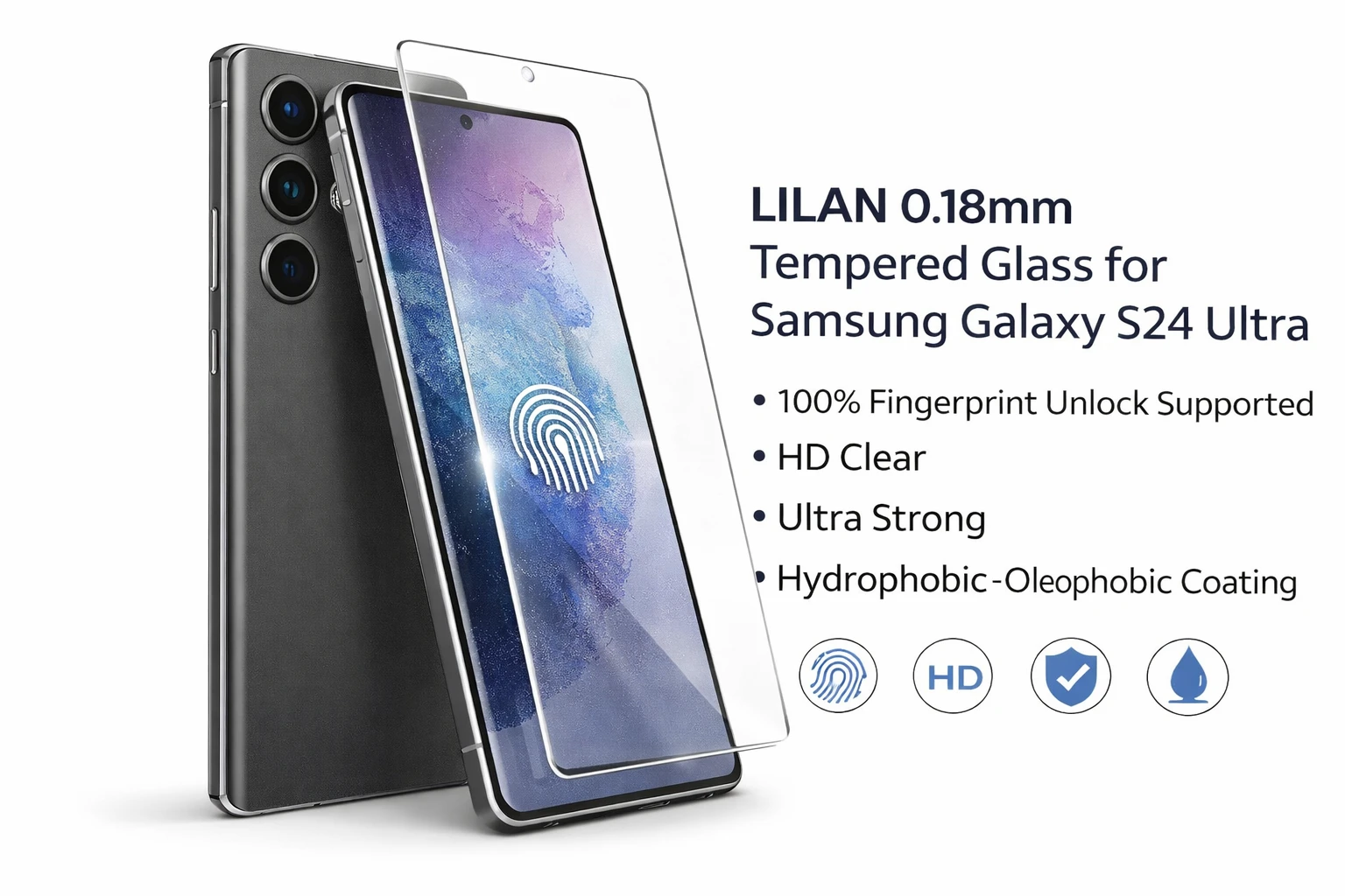 LILAN 0.18mm Tempered Glass for Samsung Galaxy S24 Ultra | Fingerprint Unlock Supported | HD Clear Screen Protector 🔹 Compatible ModelSamsung Galaxy S24 Ultra 🔹 MaterialPremium Tempered Glass (0.18mm) 🔹 ColorTransparent / Clear 🔹 Thickness0.18mm Ultra Thin 🔹 About This Item (Key Features)✅ 100% Fingerprint Unlock Support Advanced glass technology ensures smooth and accurate in-display fingerprint unlocking. ✅ Ultra Thin 0.18mm Design Maintains original touch sensitivity and display clarity. ✅ HD Clear & AR Coating Crystal-clear viewing experience with no color distortion. ✅ ESD Anti-Static Protection Protects screen from electrostatic discharge during use. ✅ Ultra Strong Glass Resistant to scratches, minor impacts, and daily wear & tear. ✅ Hydrophobic Oleophobic Coating Repels water, oil, fingerprints, and smudges easily. 🔹 In the Box📦 1 × LILAN Tempered Glass for Samsung Galaxy S24 Ultra 📦 Cleaning Kit (Wet Wipe + Dry Wipe) 🔹 Installation✔ Easy DIY installation ✔ Bubble-free application ✔ Case-friendly design 🔹 WarrantyNo Warranty (Consumable Item) 🔹 Country of OriginChina 🔹 Ideal For✔ Daily screen protection ✔ Scratch & dust protection ✔ Smooth fingerprint usage 🔹 Legal / Safety Note⚠This product is NOT a Samsung original accessory ⚠Compatible third-party tempered glass |