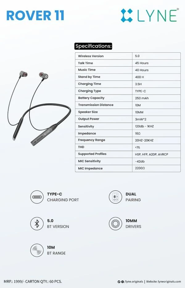 Elevate Your Music Journey: Lyne Rover 11 Neckband with 40 Hours Playtime – Assorted Colors, 6-Month Warranty Embark on a musical adventure with the Lyne Rover 11 Neckband, offering an extraordinary 40 hours of playtime on a single charge. With magnetic buds for secure storage and convenient access, along with dual pairing capability and powerful 10mm drivers, this neckband delivers a dynamic and immersive listening experience. Enjoy seamless connectivity with a coverage range of 10m, allowing you to move freely while staying connected to your music. Available in assorted colors to suit your style, and backed by a 6-month warranty for added peace of mind, the Lyne Rover 11 Neckband is your perfect companion for all-day music enjoyment Uninterrupted Music Experience: Lyne Rover 11 Neckband (40 Hours Playtime) Immerse yourself in a world of uninterrupted music with the Lyne Rover 11 Neckband. With an impressive 40 hours of playtime, magnetic buds for easy storage, dual pairing capabilities, powerful 10mm drivers, and a wide coverage range of up to 10 meters, this neckband is designed to redefine your listening experience. #### **Key Features:** 1. **Extended Playtime:**  – *Music All Day:* With an incredible 40 hours of playtime on a single charge, the Lyne Rover 11 ensures that your music never stops. Enjoy continuous playback for extended periods without the need for frequent recharging. 2. **Magnetic Buds:**  – *Convenient Storage:* The magnetic buds of the Lyne Rover 11 allow for easy and tangle-free storage when not in use. Simply snap the buds together around your neck when taking a break from your music, ensuring they stay securely in place. 3. **Dual Pairing:**  – *Connect Two Devices:* Seamlessly switch between two paired devices with the Lyne Rover 11’s dual pairing feature. Effortlessly connect to your smartphone and tablet simultaneously, allowing you to stay connected without missing a beat. 4. **Powerful 10mm Drivers:**  – *Immersive Sound:* Experience immersive sound quality with the Lyne Rover 11’s powerful 10mm drivers. Enjoy deep bass, clear vocals, and crisp highs, delivering an exceptional audio experience across a wide range of genres. 5. **Wide Coverage Range:**  – *Stay Connected:* With a coverage range of up to 10 meters, the Lyne Rover 11 ensures a stable and reliable connection to your paired devices. Move freely without worrying about signal loss or interruptions to your music. 6. **Comfortable and Lightweight Design:**  – *All-Day Comfort:* Designed for comfort, the Lyne Rover 11 features a lightweight and ergonomic neckband that sits comfortably around your neck. The soft earbuds provide a snug fit, perfect for long listening sessions. 7. **Built-in Controls:**  – *Easy Operation:* Control your music, adjust the volume, and take calls with ease using the built-in controls of the Lyne Rover 11. Stay connected and in control without having to reach for your device. #### **Why Choose Lyne Rover 11 Neckband?** – **Exceptional Playtime:** Enjoy an incredible 40 hours of uninterrupted music playback. – **Convenient Magnetic Buds:** Store your neckband easily with magnetic buds for tangle-free storage. – **Dual Pairing:** Seamlessly switch between two connected devices for added convenience. – **Powerful Sound:** Experience immersive sound quality with powerful 10mm drivers. – **Wide Coverage Range:** Stay connected with a stable Bluetooth connection up to 10 meters away. Elevate your music listening experience with the Lyne Rover 11 Neckband. Enjoy uninterrupted music playback, powerful sound, and convenient features for an immersive audio experience. Order now and take your music on the go. *Lyne – Redefining Wireless Audio. |