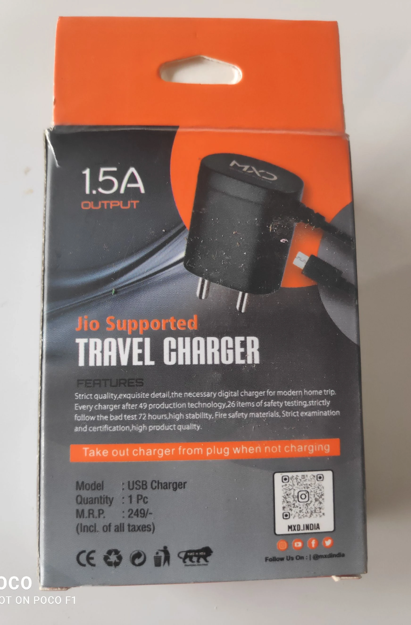 MXD QUALITY FOR EVERYONE 1.5A OUTPUT JIO SUPPORTED TRAVEL CHARGER MXD -163 OUTPUT -1.5A MODEL USB CHARGER QUANTITY 1PC |