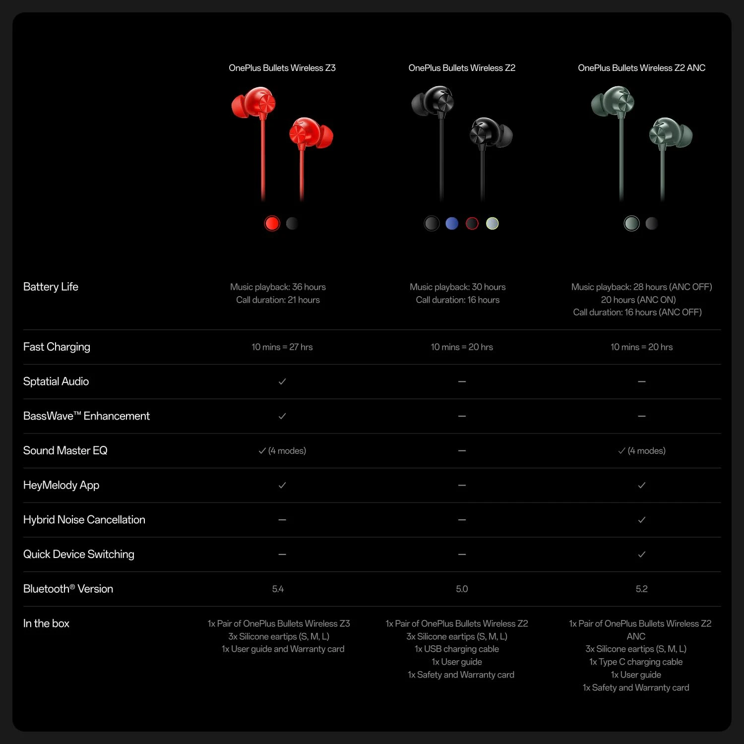 📝 Product DescriptionExperience powerful sound and all-day comfort with OnePlus Bullets Wireless Z3 Bluetooth Neckband. Designed for music lovers and daily users, this neckband delivers deep bass performance, clear vocals, and stable Bluetooth connectivity. The lightweight and foldable design ensures comfortable wear for long hours, while the fast charging support keeps you powered up quickly. With up to 24 hours of playback, you can enjoy uninterrupted music, calls, and entertainment throughout the day. Built with water-resistant construction, the Bullets Wireless Z3 is suitable for everyday use. Whether you're working, traveling, or relaxing, this neckband offers reliable performance backed by OnePlus brand quality. ⚙️ SpecificationsGeneral