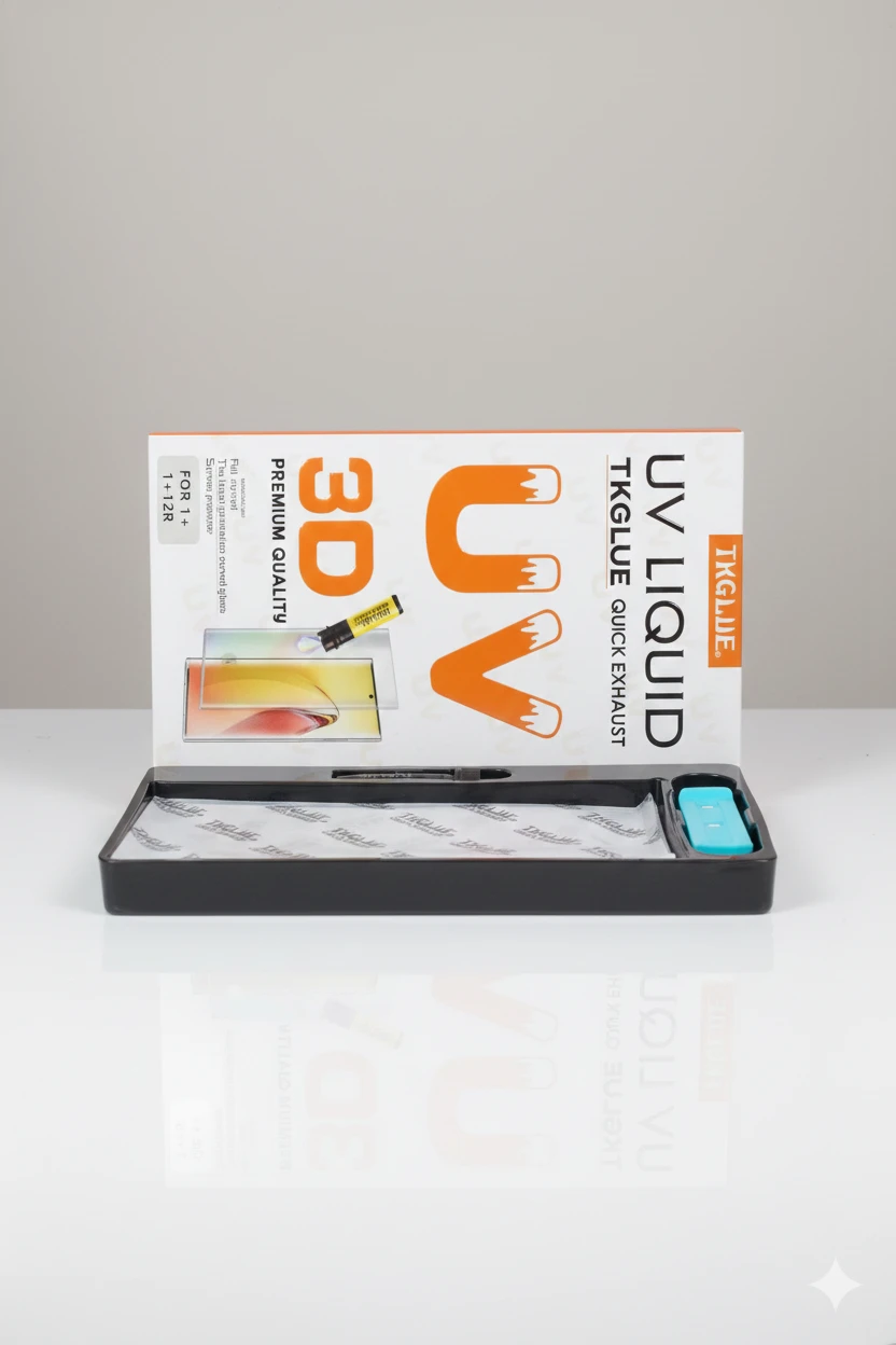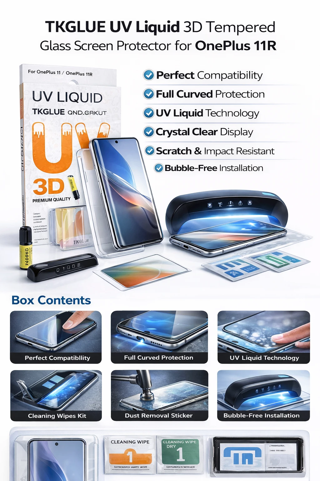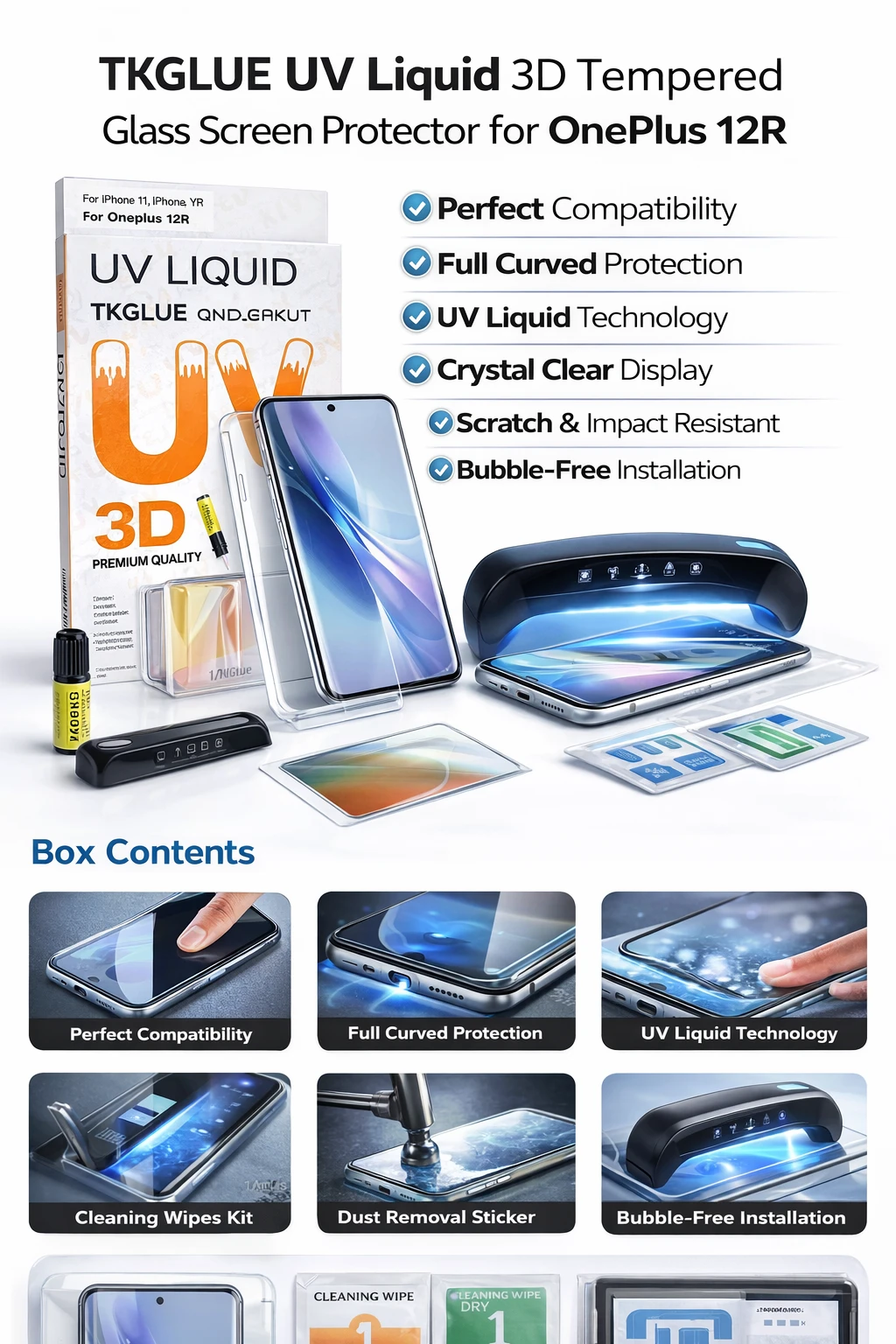 🧾 Product DescriptionProtect your smartphone screen with TKGLUE UV Liquid 3D Tempered Glass, specially designed for OnePlus 12R. This premium screen protector uses advanced UV liquid adhesive technology that spreads evenly across the screen, ensuring strong bonding, zero bubbles, and perfect touch sensitivity. The 3D curved edge design offers complete edge-to-edge coverage, unlike normal tempered glass. It provides crystal-clear display clarity, preserves original touch response, and protects your screen from scratches, cracks, dust, and daily wear. Ideal for users who want professional-grade screen protection at home. ⭐ Key Features🔹 Perfect CompatibilityPrecisely designed for OnePlus 12R, ensuring accurate fit with proper cut-outs. 🔹 3D Full Curved ProtectionCovers the entire screen including curved edges for maximum safety. 🔹 UV Liquid TechnologyLiquid adhesive fills microscopic gaps for better grip and long-lasting protection. 🔹 Crystal Clear DisplayHD transparency maintains original screen brightness and color quality. 🔹 Scratch & Impact Resistant9H hardness protects against scratches, minor drops, and daily damage. 🔹 Bubble-Free InstallationUV curing process ensures smooth, bubble-free finish. 📦 Box Contents
