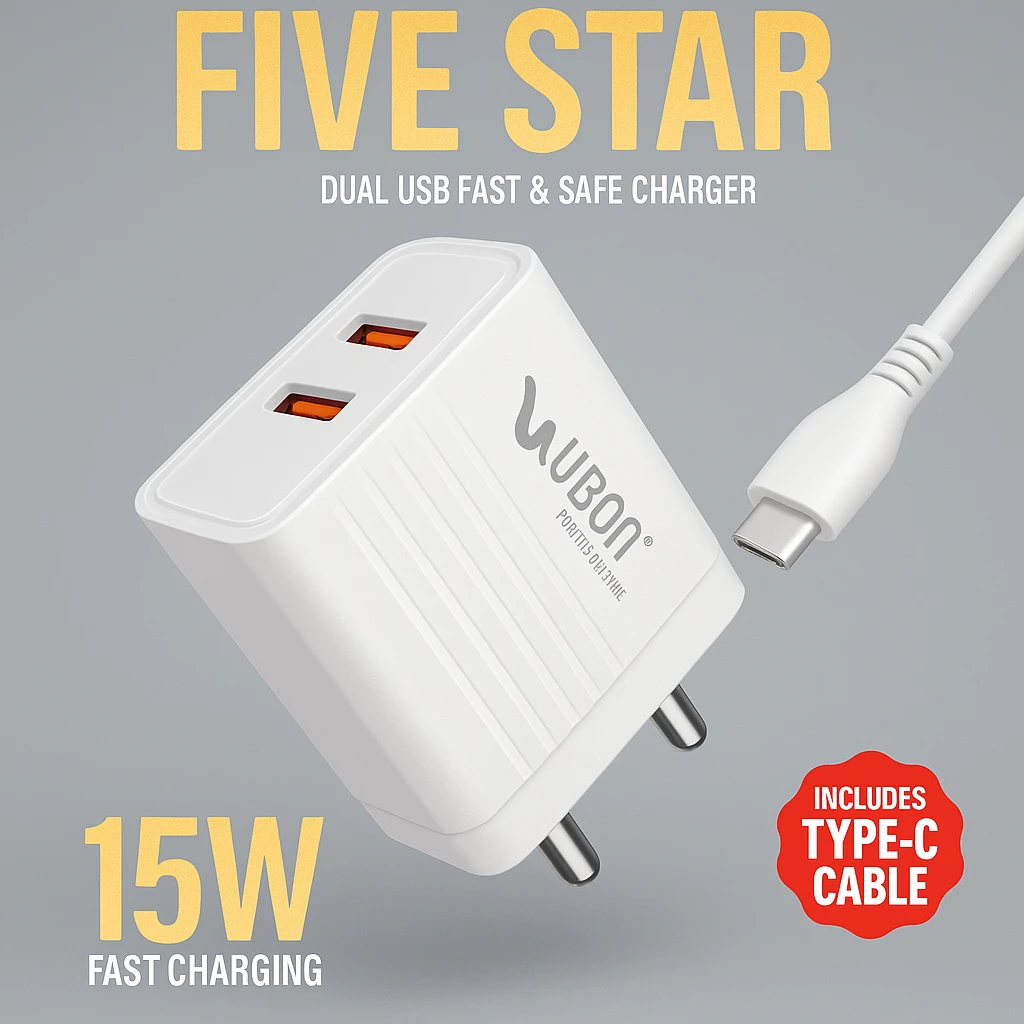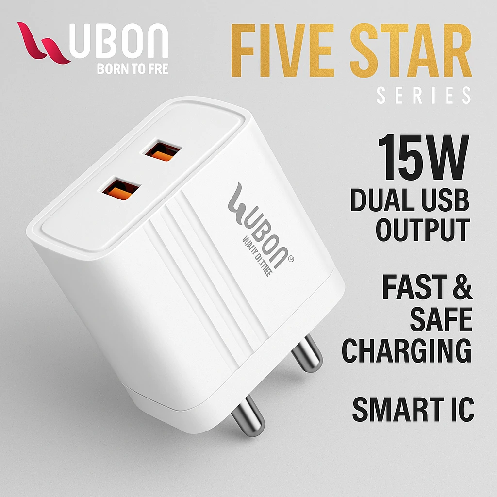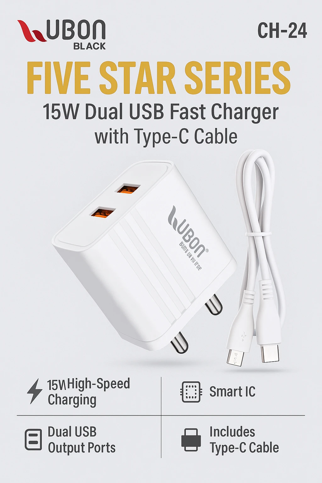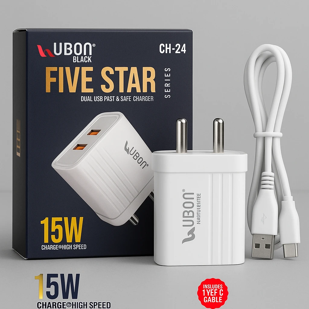 ✅ 4. Short DescriptionUBON CH-24 Five Star Series 15W Fast Charger with dual USB ports, Smart IC, and complete safety protection. Comes with a durable Type-C charging cable. ✅ 5. Long DescriptionThe UBON Black CH-24 Five Star Series Mobile Charger is designed to deliver fast, efficient, and safe charging for your everyday devices. Equipped with dual USB ports, it allows you to charge two devices simultaneously without compromising speed. Smart IC technology ensures optimal power delivery based on your device’s requirements, keeping your mobile safe throughout the charging cycle. The charger offers multiple safety layers including over-voltage protection, short-circuit protection, and overheating protection, making it highly reliable. Its compact and lightweight build makes it ideal for travel, office use, or daily charging needs. A strong and durable Type-C cable is included in the box for a complete charging solution. ✅ 6. Key Features / Highlights