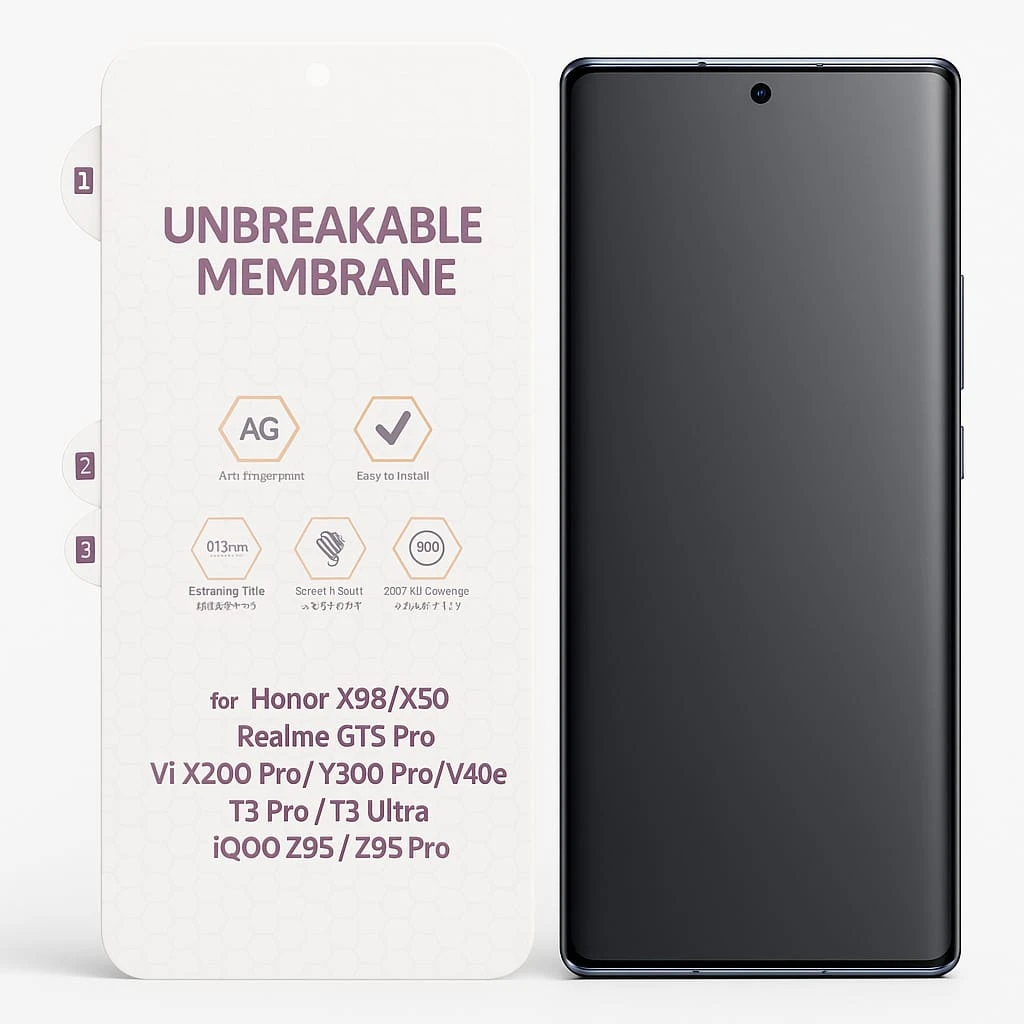 ✅ Short DescriptionUltra-thin 0.15mm unbreakable membrane with smooth touch, matte feel, anti-glare finish, bubble-free installation and full edge-to-edge protection. Compatible with multiple Honor, Realme, Vivo & iQOO models. ✅ Full DescriptionThis Premium Unbreakable Membrane Screen Guard is made with high-quality flexible nano material to protect your smartphone from scratches, fingerprints and minor impacts. It provides complete coverage, excellent touch response and long-lasting durability. ⭐ Key Features