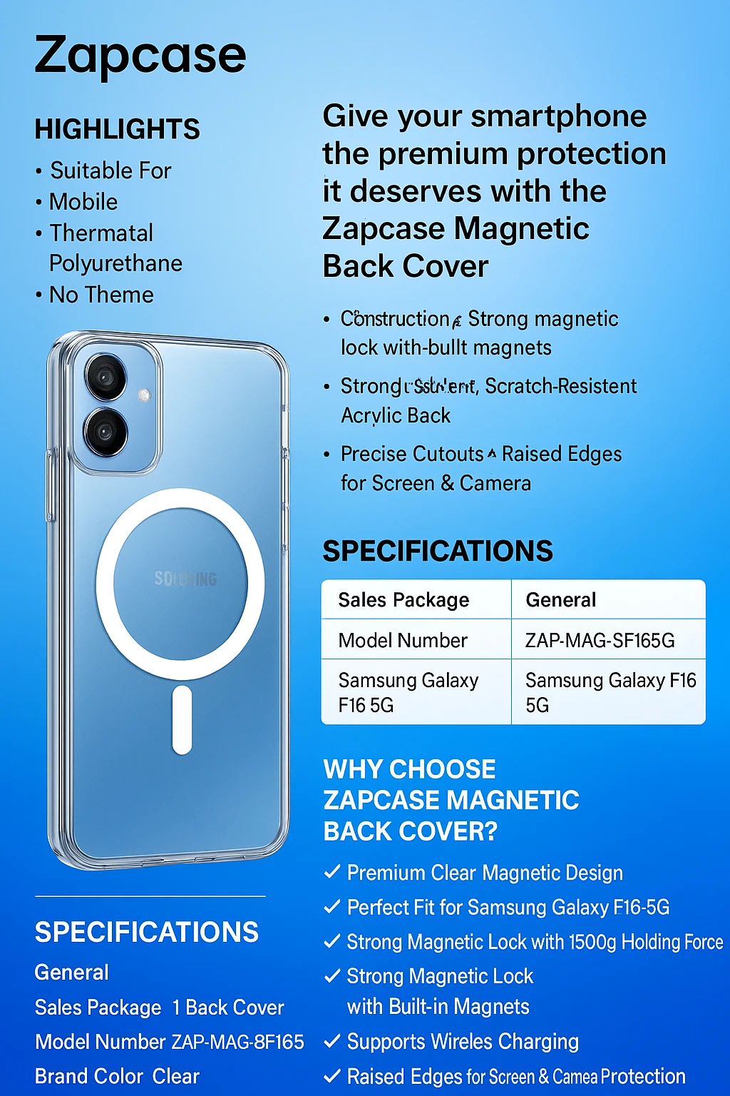 DescriptionPhone case is an essential Accessory of your cell phone. A phone case not only improves the aesthetics of your phone but also adds to the durability and Life of your gadget. A sturdy phone case protects your phone from accidental spills, splashes and shocks. All our Cases are thoroughly tested for its Durability and Quality. Zapcase Back Case Cover gives a Premium Look with Strong Magnetic Lock & powerful built-in magnets with 1,500g of holding force enable faster, easier place-and-go wireless charging and a secure lock on any HaloLock accessory. Strong enough to protect it from bumps, drops and scratches. The Cases are designed to protect the Screen & Camera from everyday ware & tare/ scratches. Scratch-resistant, crystal-clear acrylic back lets you show off your Samsung Galaxy F16 5G’s true style in stunning clarity that lasts. The case has openings precisely made for the charger port / dock connector, headset jack and speaker which allow you full access to all the functions on your device. Specifications General