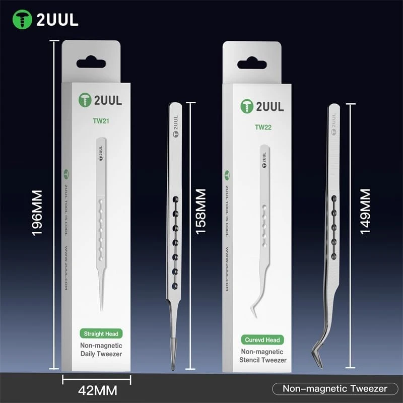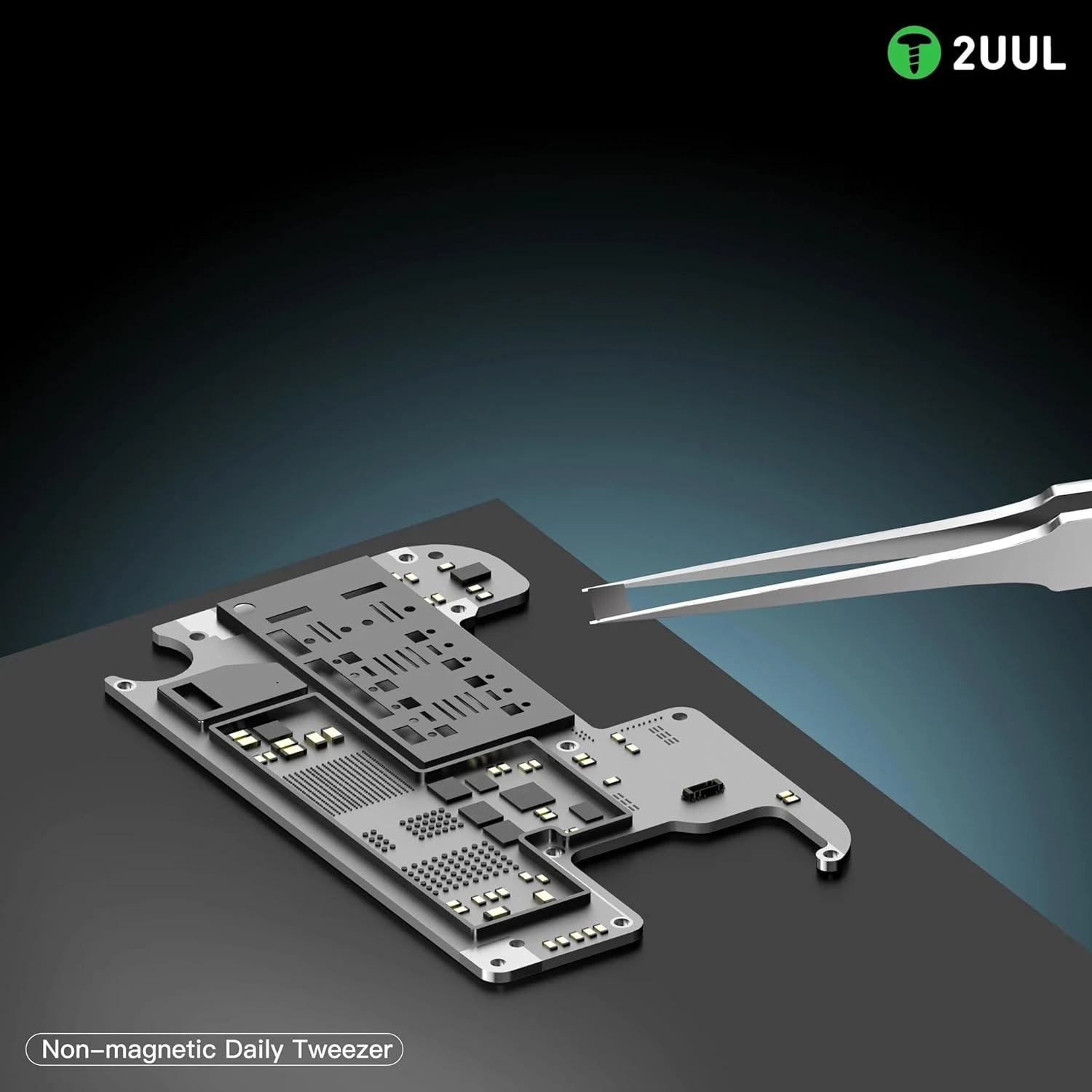 📄 Product DescriptionThe 2UUL TW21 Non-Magnetic Daily Tweezer is a high-precision professional tool designed specifically for mobile phone board and electronic repairs. Crafted from premium stainless steel, it offers excellent strength, corrosion resistance, and long-lasting performance. Its straight tip design allows accurate handling of tiny IC chips, connectors, screws, and micro components. The non-magnetic property ensures safe operation around sensitive electronic parts, preventing accidental interference or damage. With an ergonomic and balanced grip, this tweezer reduces hand fatigue and provides superior control during extended repair work. Whether you are performing micro-soldering, PCB repairs, or detailed electronics handling, the 2UUL TW21 ensures precision, safety, and efficiency. An essential tool for professional technicians and DIY repair users, suitable for smartphones, tablets, and electronic circuit boards. 📦 In The Box