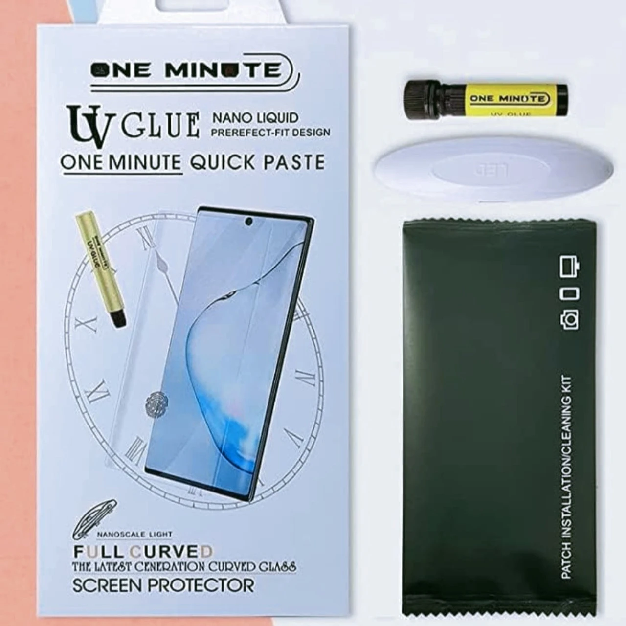 - one minute uv glass (tempered glass) ,1uv glue ,1uv light and cleaning cloth and cleaning sticker