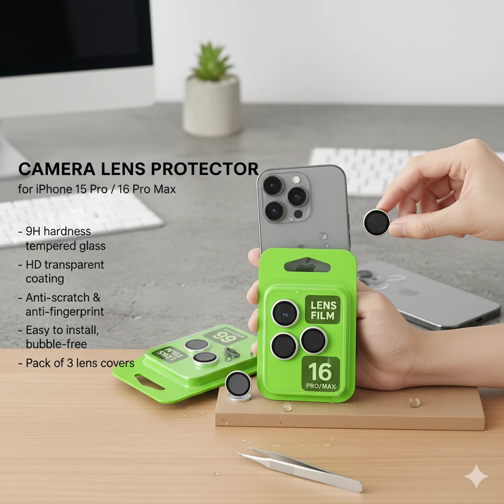 📜 Description (EN): Premium tempered glass camera lens protector designed for iPhone 15 Pro and 15 Pro Max. It provides ultimate protection against scratches, dust, and fingerprints while maintaining the original photo clarity. Easy to install, bubble-free, and precisely cut to fit the camera lens perfectly without affecting flash or picture quality. ⚙️ Specifications / Highlights: