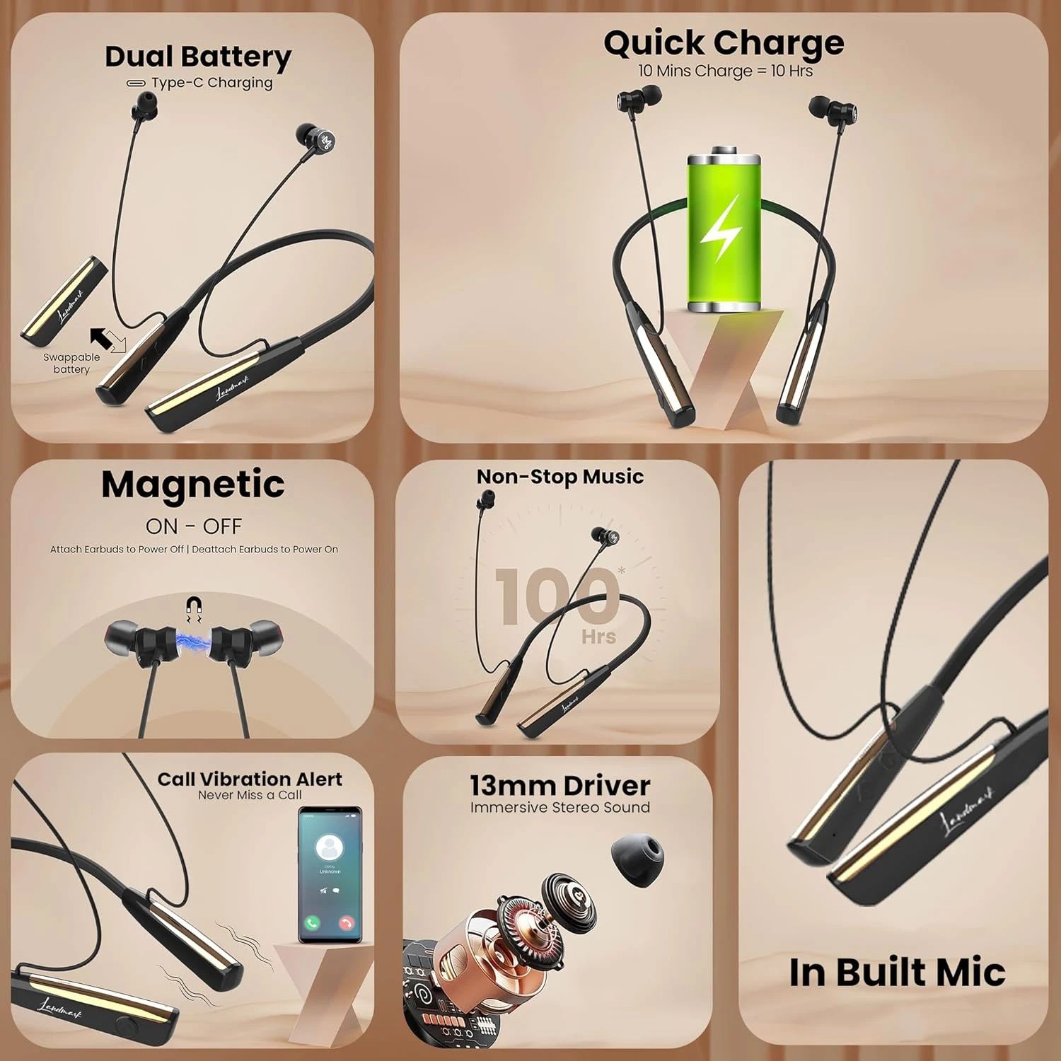 🟧 Short DescriptionEnjoy nonstop music with LANDMARK LM BH153 Bluetooth Neckband. Featuring 10 minutes fast charge for 10 hours playtime, super bass 10mm drivers, magnetic earbuds, call vibration alert, and Type-C fast charging, this neckband is perfect for daily use and travel. ⭐ Key Highlights