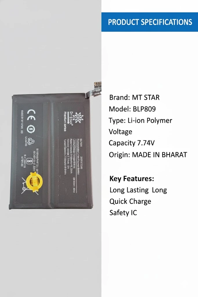 Product Description:Apne mobile phone ki life badhayein MT STAR Premium Series BLP809 battery ke saath. Yeh high-quality Li-ion Polymer battery khaas taur par lambi performance aur safety ke liye design ki gayi hai. Ismein controlling switches aur temperature fuse diya gaya hai jo ise overheating aur overcharging se bachata hai. "Made in Bharat" hone ke naate, yeh ek bharosemand aur durabe product hai. Product Specifications (Details):