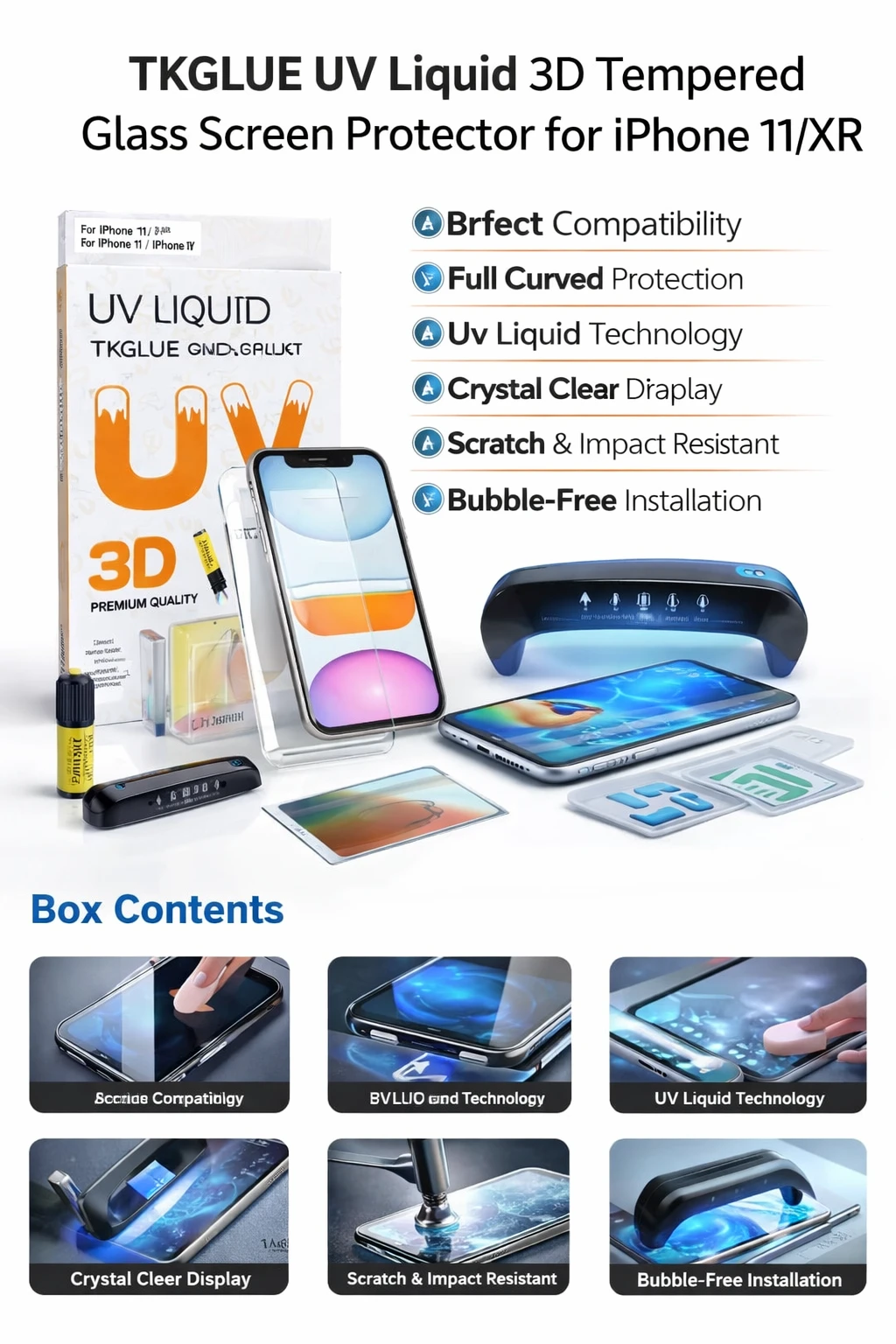 🧾 Product DescriptionProtect your smartphone screen with TKGLUE UV Liquid 3D Tempered Glass, specially designed for OnePlus 12R. This premium screen protector uses advanced UV liquid adhesive technology that spreads evenly across the screen, ensuring strong bonding, zero bubbles, and perfect touch sensitivity. The 3D curved edge design offers complete edge-to-edge coverage, unlike normal tempered glass. It provides crystal-clear display clarity, preserves original touch response, and protects your screen from scratches, cracks, dust, and daily wear. Ideal for users who want professional-grade screen protection at home. ⭐ Key Features🔹 Perfect CompatibilityPrecisely designed for OnePlus 12R, ensuring accurate fit with proper cut-outs. 🔹 3D Full Curved ProtectionCovers the entire screen including curved edges for maximum safety. 🔹 UV Liquid TechnologyLiquid adhesive fills microscopic gaps for better grip and long-lasting protection. 🔹 Crystal Clear DisplayHD transparency maintains original screen brightness and color quality. 🔹 Scratch & Impact Resistant9H hardness protects against scratches, minor drops, and daily damage. 🔹 Bubble-Free InstallationUV curing process ensures smooth, bubble-free finish. 📦 Box Contents