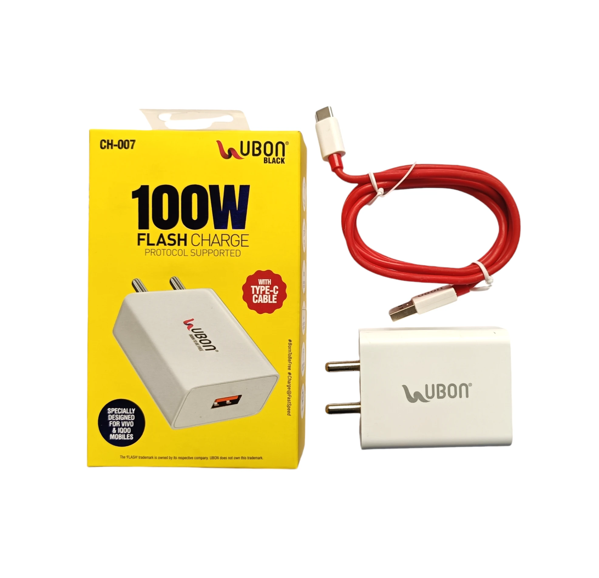 ⭐ Product Highlights ⚡ 100W Ultra Fast Flash Charging 🔥 Flash Charge Protocol Supported 🔌 Includes High-Quality Type-C Cable 📱 Specially Optimized for Vivo & iQOO Smartphones 🔰 Advanced Protection: OVP, OCP, SCP 🧳 Compact, Durable & Travel Friendly Design 🇮🇳 Made in India 📘 Technical Specifications Charger Details Feature Specification Brand UBON Black Model CH-007 Output Power 100W Flash Charge Input AC 100-240V, 50/60Hz, 1.1A Output 100W Max Output Port USB-A Flash Charge Port Flash Protocol Supported (as per device compatibility) Material Premium ABS Fire-Resistant Body Safety Features Over-Voltage, Over-Current, Short-Circuit Protection Color White Made In India Included Cable Feature Specification Cable Type USB-A to Type-C Cable Length 1 Meter Build Type High-Quality Flash-Supported Cable Compatibility Vivo/iQOO/Android Devices 📦 Package Contents 1 × UBON 100W Flash Charger (CH-007) 1 × Flash-Supported Type-C Cable 💡 Key Benefits 🚀 Charge Smartphone from 0–100% in very less time 🔥 High-powered Flash Charge technology 🔌 Perfect for gaming & heavy phone users 🌍 Ideal for Home, Car, Office & Travel Use 🛡️ Safety IC ensures smart power delivery 📝 Product Description UBON CH-007 100W Flash Charge is engineered for users who demand extreme charging speed with maximum safety. Designed especially for Vivo & iQOO devices, this charger supports Flash Protocol, delivering lightning-fast power without damaging the battery. Its compact size, strong build quality, and advanced IC protection make it a dependable choice for everyday use. The included Type-C cable ensures smooth, stable, and efficient power delivery. |