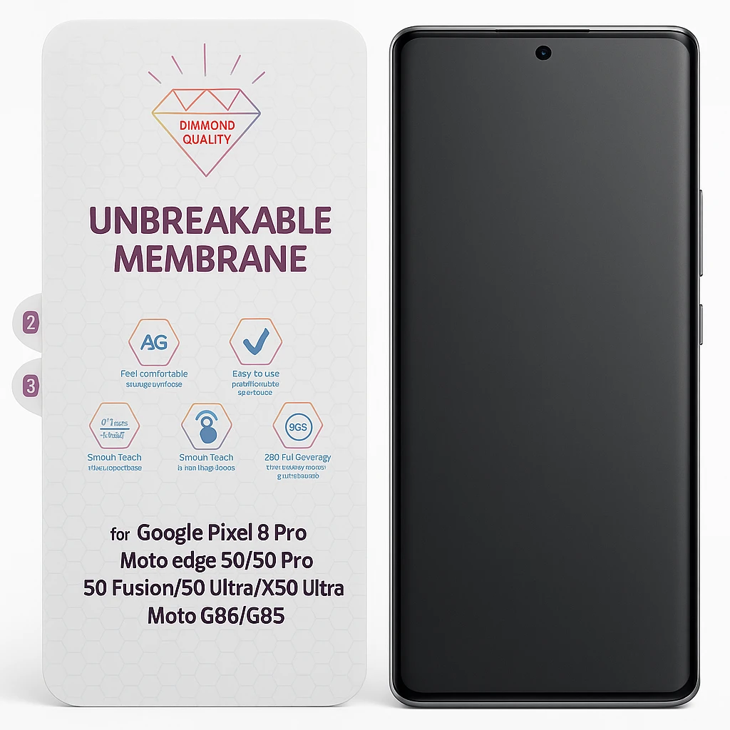 ✅ Short DescriptionDiamond Quality Unbreakable Membrane with 0.15mm thin flexible nano layer, matte feel, smooth touch, anti-glare, and bubble-free installation. Supports Pixel & Moto models. ✅ Full DescriptionThis Diamond Quality Unbreakable Membrane offers long-lasting screen protection with a flexible nano-film design that never cracks like tempered glass. It provides 360° full coverage, ultra-smooth touch response and excellent clarity. ⭐ Key Features
